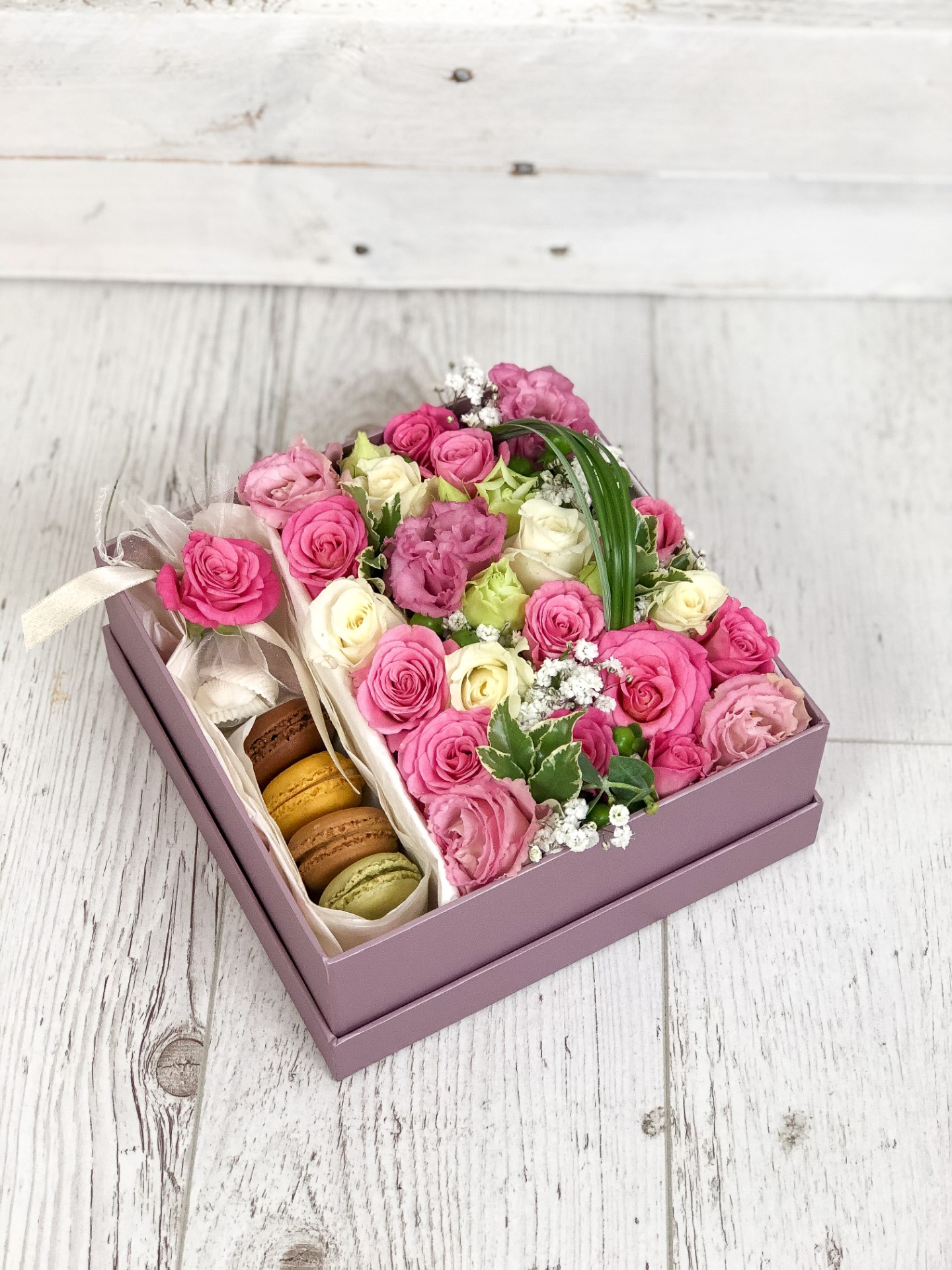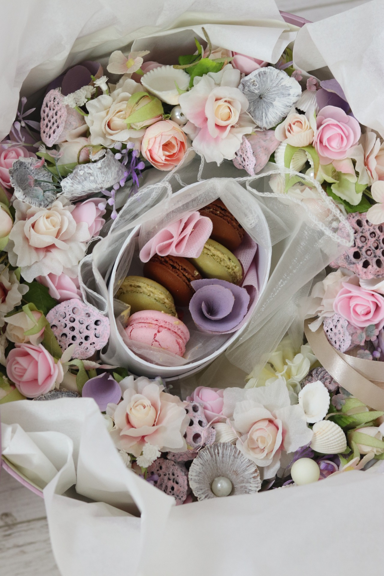 Helló Julcsi Basic-box. (4 db macaron + virág + doboz)